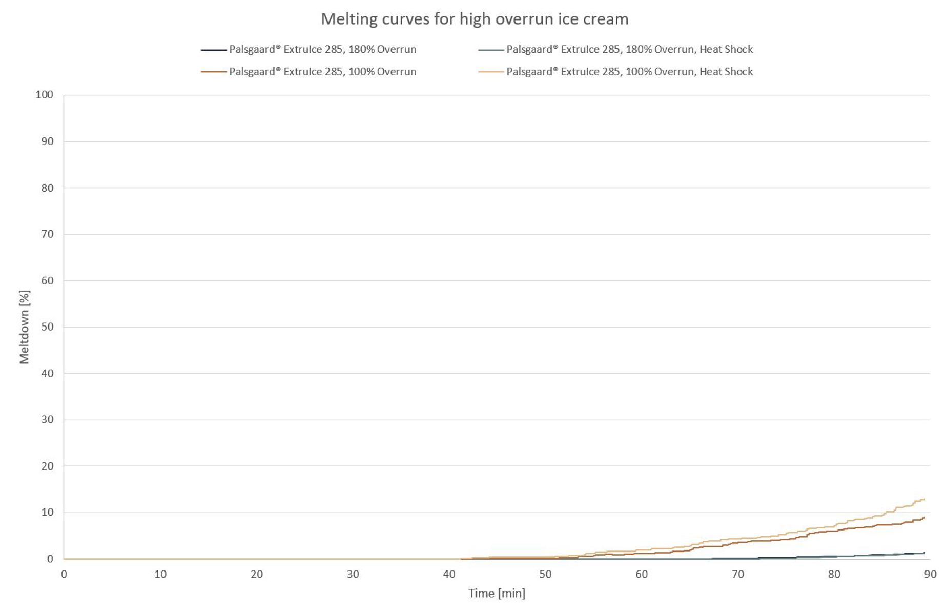 El uso de Palsgaard® ExtruIce 285, que contiene éster de ácido láctico de monoglicéridos y diglicéridos, tuvo un efecto tremendo tanto en el procesamiento como en la fusión, así como en las cualidades sensoriales del helado. La adición de LACTEM facilitó la producción de helado de alta cobertura con una estructura estable. Además, mejoró las propiedades sensoriales al crear un helado cremoso y con mucho cuerpo. Incluso el helado de ala cobertura expuesto al choque térmico tenía una sensación en boca cremosa y suave.