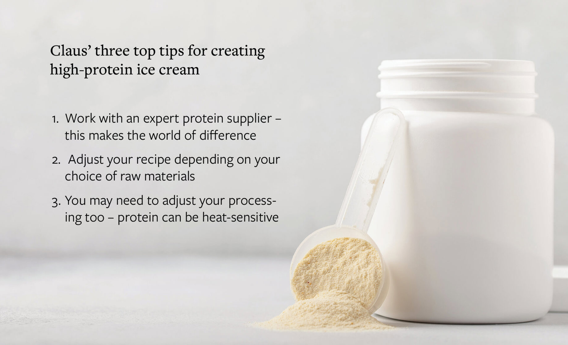 结果产生了两个新的冰淇淋配方 — — 一个配有10%的蛋白质,一个配有15%的蛋白质。 以百分比为基础开展工作是一个非常周密的决定。 “要记住,声称“高蛋白质”并非基于冰淇淋中的蛋白质总量,而是基于多少蛋白质对冰淇淋总能量的贡献,冰淇淋的能量必须至少达到20%。" 圣诞老人说。“半升的冰淇淋浴可能含有21克蛋白质,但如果你不得不吃整个东西,这并不好。 此外,像“每部分7克蛋白质”这样的主张可能非常混乱,因为每个人都对哪一部分有不同的看法。 这就是为什么我们决定按百分率或克数来工作。 ”